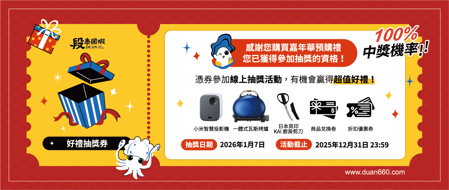 100%中獎機率,人人有獎,驚喜不斷