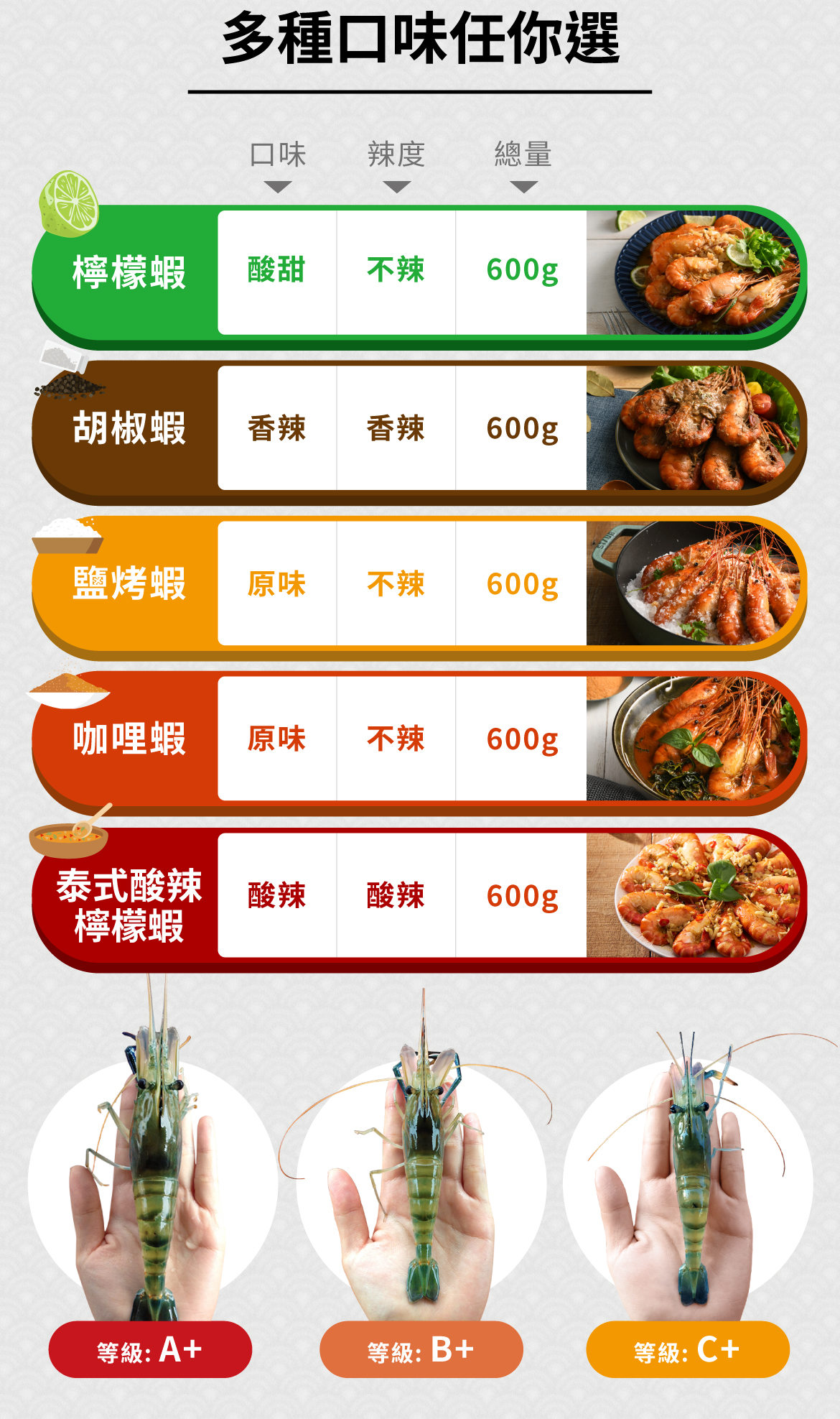 組合內含:1包| 加大隱藏版C級新手上路款|硬殼|公母混合|每包約19~20隻|600克/包1瓶| 泰式檸檬蒸醬|300g/瓶懶人也能輕鬆上菜 !想吃泰式檸檬蝦,不必再出門餐廳 !嚴選段泰國蝦招牌鮮活...